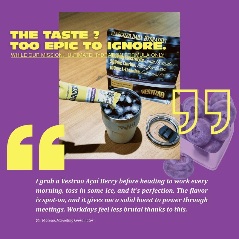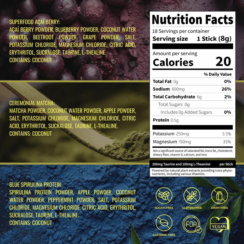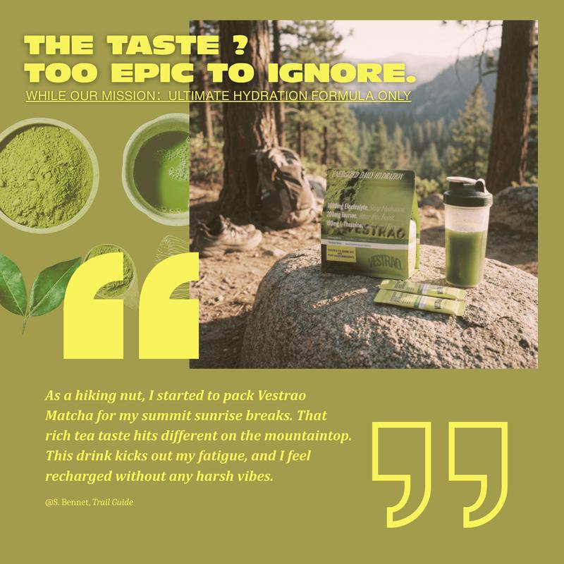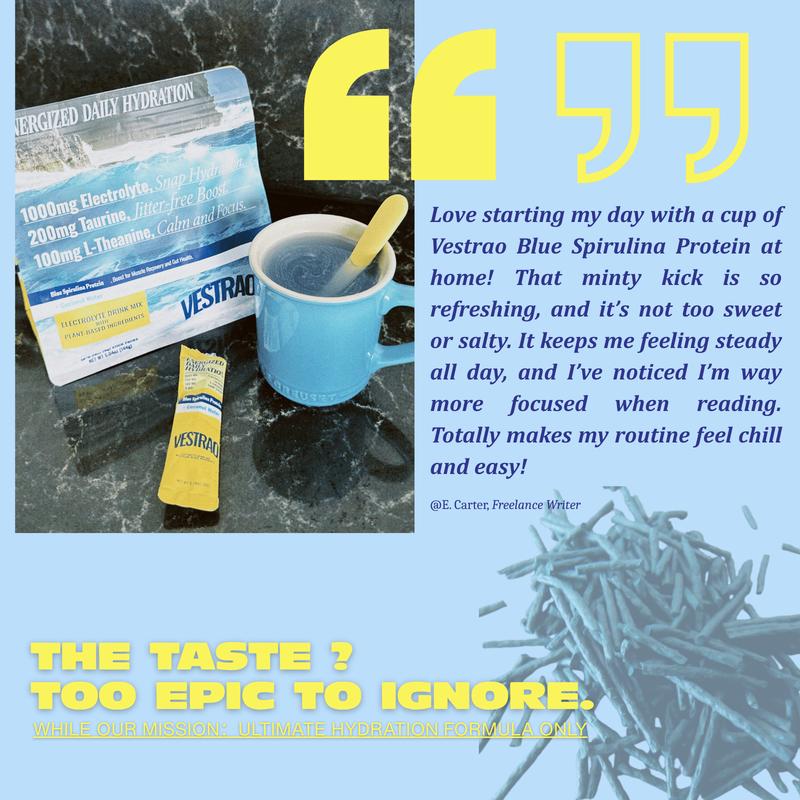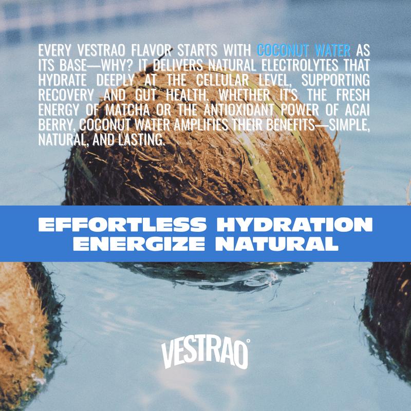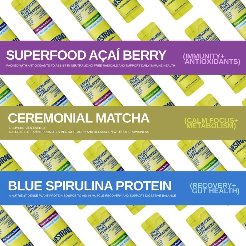 VESTRAO Hydration Energy Electrolyte Powder – 1000mg Scientific Blend with Taurine & L-Theanine for Calm Focus & Smooth Energy – Superfood Drink Mix Enhanced with Blue Spirulina Protein, Acai & Matcha – Zero Sugar Stick Packs